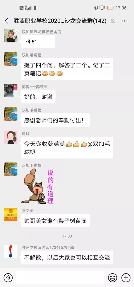 在直播間里對(duì)于學(xué)員們的提問(wèn),老師們都一 一作了有效解答,例如果樹(shù)的病蟲(chóng)害防治及管理、生豬養(yǎng)殖技術(shù)及疫病管理和農(nóng)產(chǎn)品銷(xiāo)售及創(chuàng)業(yè)貸款等。先后有170余人進(jìn)入直播間進(jìn)行直播互動(dòng),活動(dòng)結(jié)束后,學(xué)員們紛紛在留言區(qū)及分享群表示學(xué)到了許多,也建議學(xué)校多多地開(kāi)展類(lèi)似活動(dòng),讓學(xué)員能夠在有限的時(shí)間與空間里更好的得到幫助。
