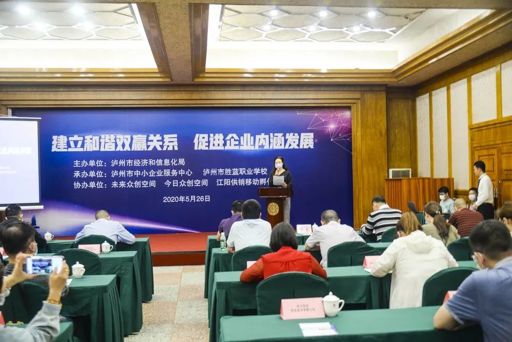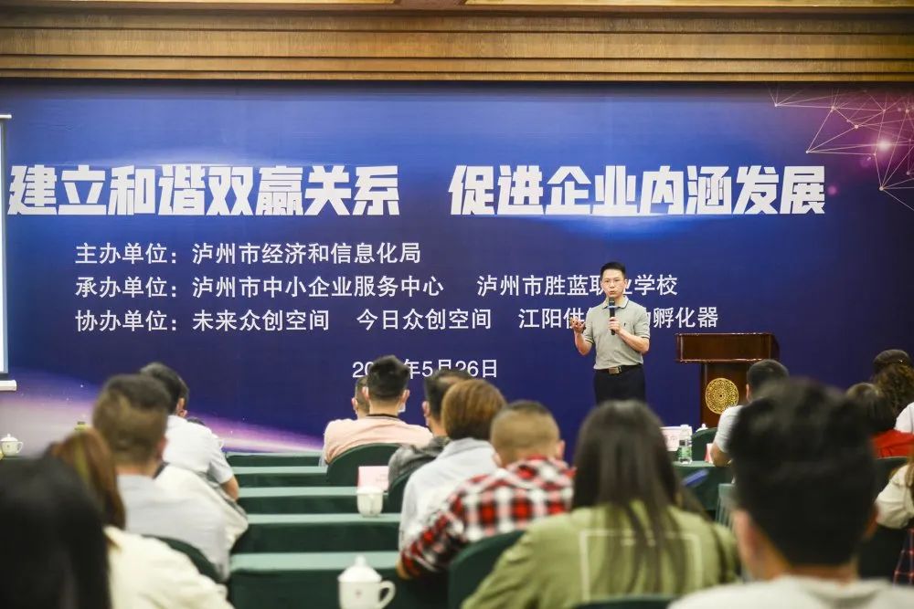 5月26日由瀘州市經(jīng)濟(jì)和信息化局主辦,瀘州市中小企業(yè)服務(wù)中心聯(lián)合瀘州市勝藍(lán)職業(yè)學(xué)校承辦,我校關(guān)聯(lián)企業(yè)未來(lái)眾創(chuàng)空間、今日眾創(chuàng)空間、江陽(yáng)供銷移動(dòng)孵化器協(xié)辦的“建立和諧雙贏關(guān)系,促進(jìn)企業(yè)內(nèi)涵發(fā)展”培訓(xùn)會(huì)在南苑賓館會(huì)議中心順利開(kāi)課。瀘州市經(jīng)濟(jì)和信息化局企業(yè)管理科科長(zhǎng)蔣中賢科出席了本次會(huì)議。